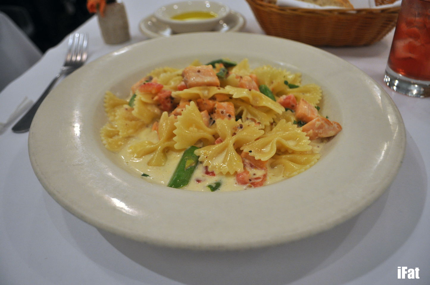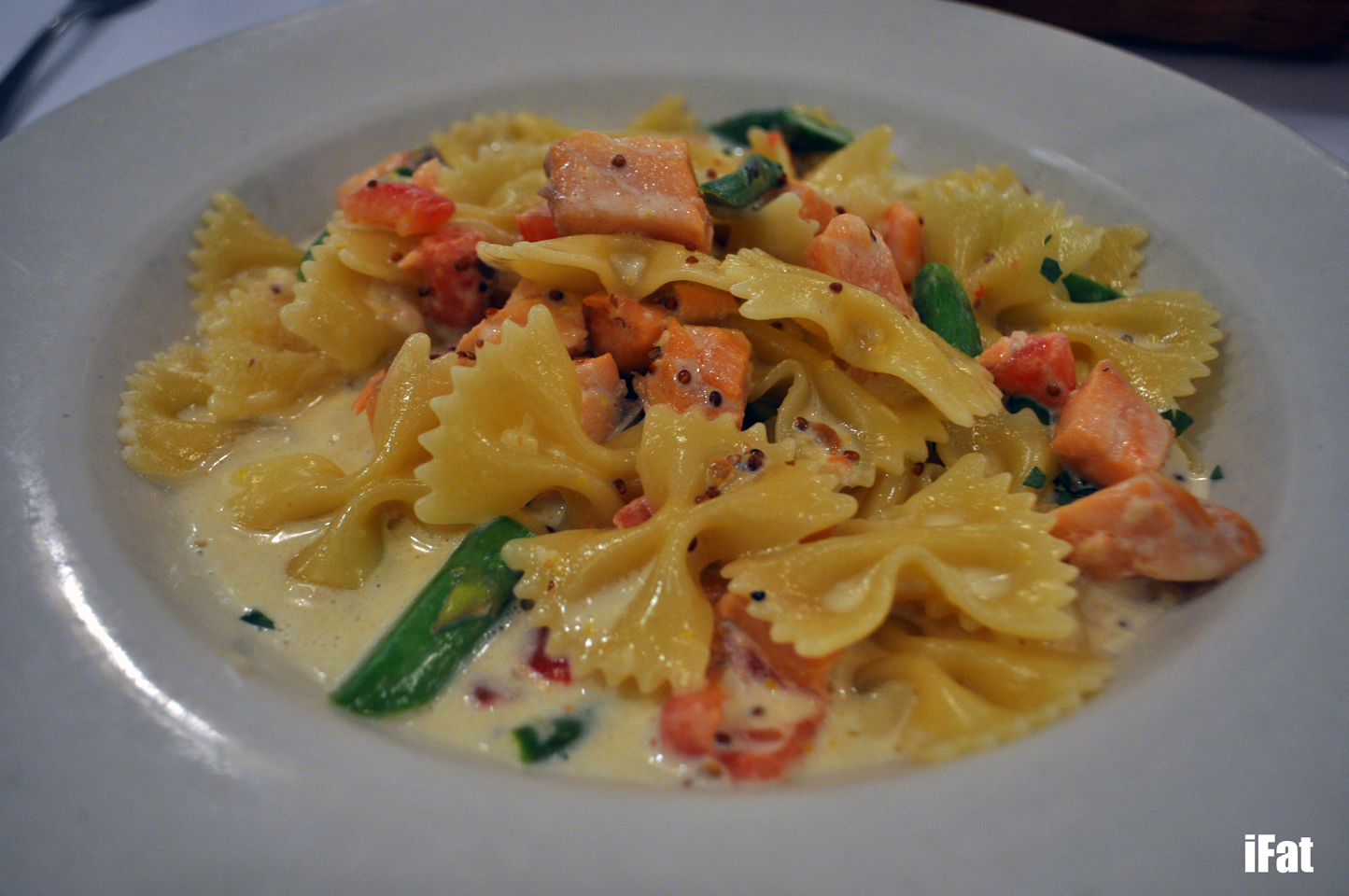 Farfelle Con Salmon e Crema aka bow tied pasta with lightly smoked salmon, tarragon grain mustard cream sauce, asparagus and fresh tomatoes.