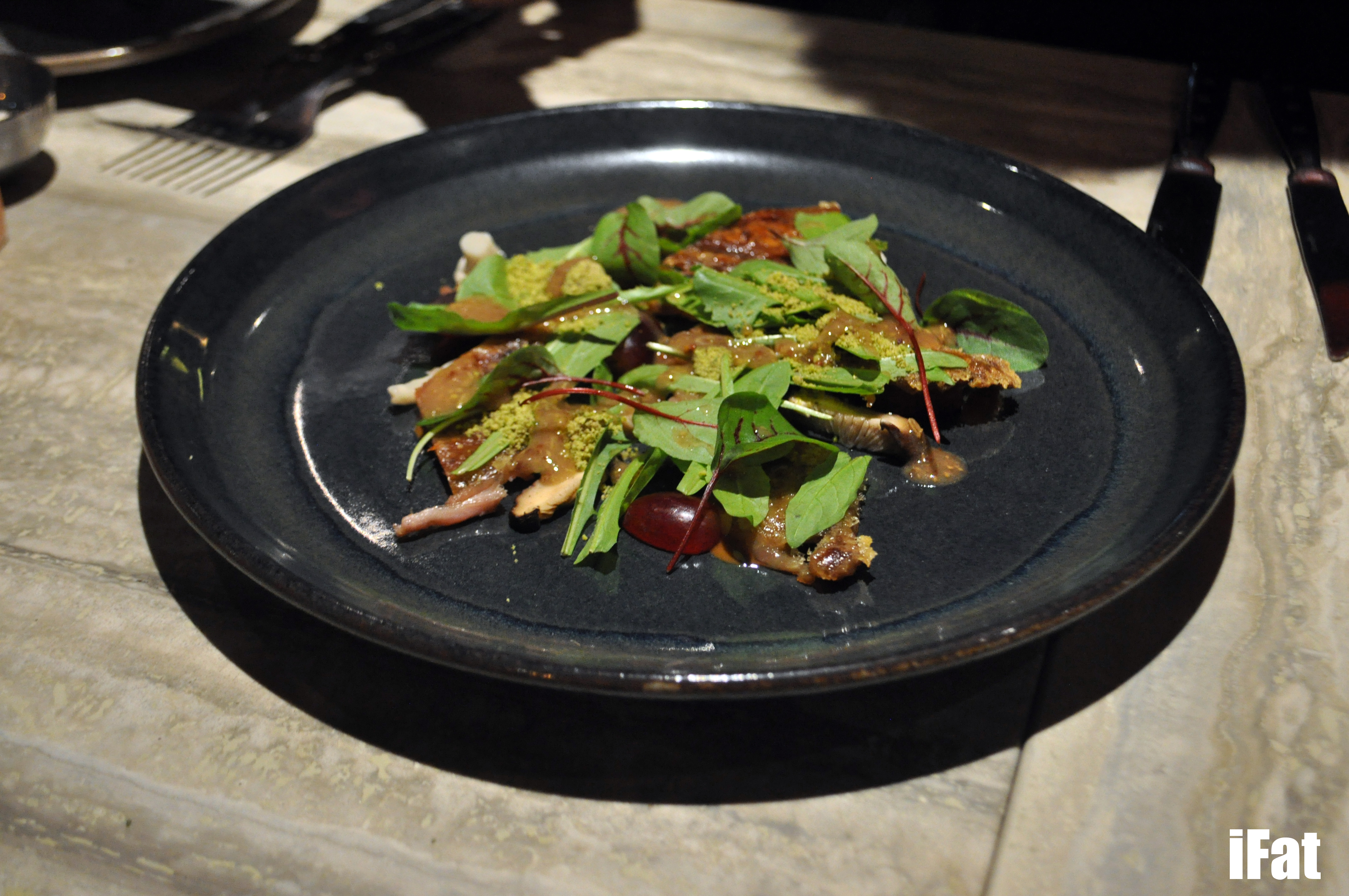 Crisp Pig’s Tail with pine purée, grapes, pickled mushrooms and pistachio